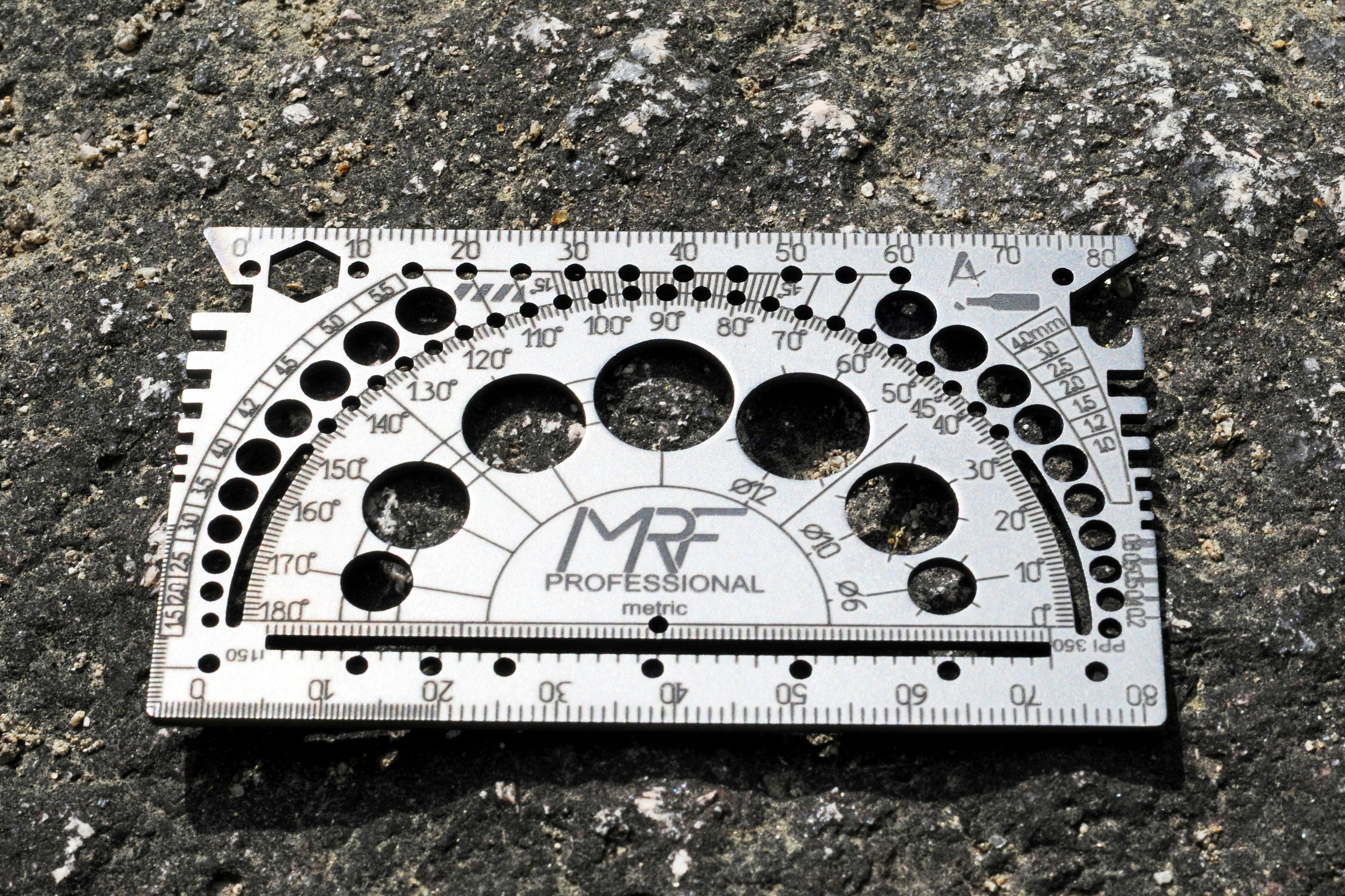 -「メートル単位(cm/mm)」「インチ単位(inch)」の目盛をカードの裏表に分けて配置。定規・コンパス・円テンプレート・ゲージは、それぞれの単位から測定できます。