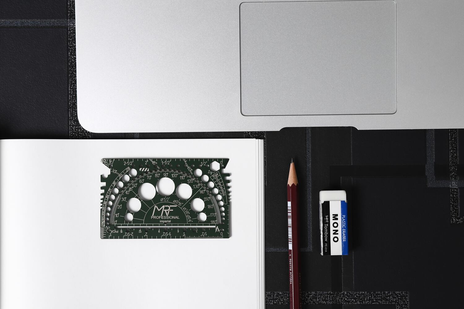 シンメトリーな目盛の配置にまでこだわったデザイナーズ定規。機能美と携帯性を備え、末永くご愛用いただけます。